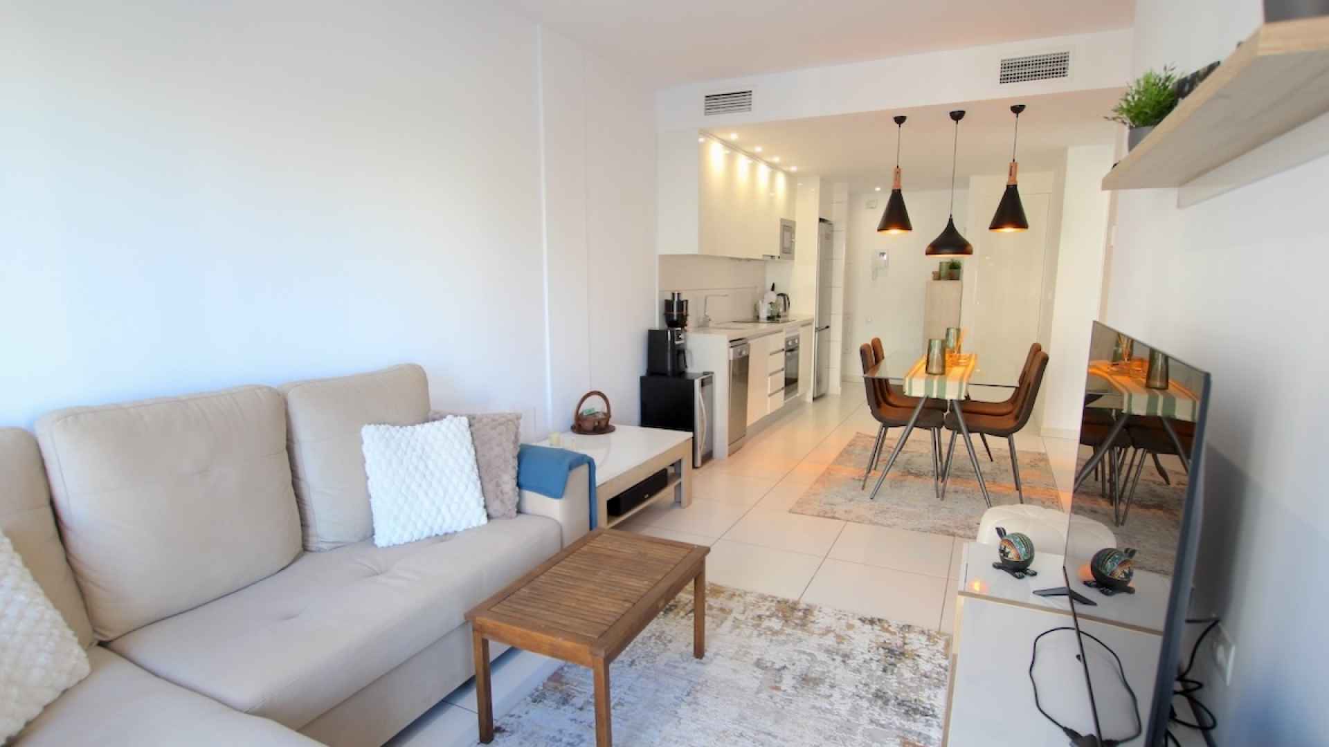 The apartment’s prime corner position fills the interior with plenty of natural light, creating a bright and inviting atmosphere throughout. The open-plan lounge and dining area flow seamlessly out to a spacious, partially covered sun terrace which overlooks two of the communal pools, an idyllic setting for morning coffee or evening sunsets. The fully equipped open plan fitted kitchen offers ample storage and workspace, complemented by a convenient utility room. Both bedrooms are generously sized doubles with the main bedroom featuring a private en-suite bathroom, while the guest bedroom is served by a stylish family bathroom.